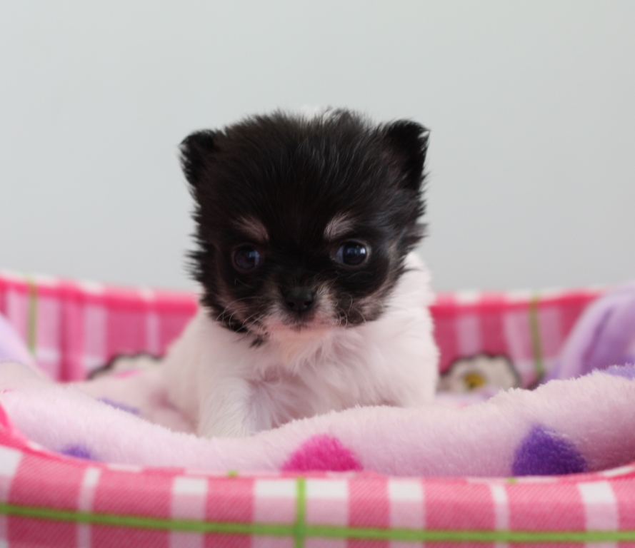 1月30日生まれ ロングコートチワワ ホワイト&ブラック(パーティ) 女の子ペットショップ・るんるん