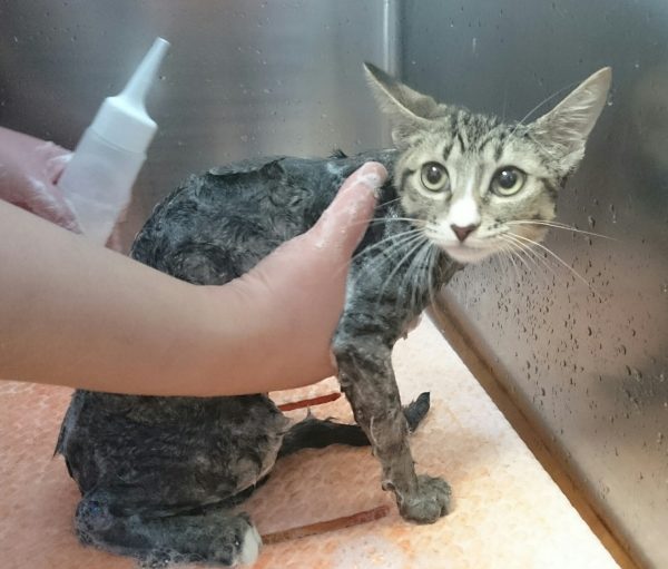 (子犬も子猫も状態が悪くなければ、まず、必ずシャンプーをして、ドライング中などに皮膚の状態など、私たちが見える、触って分かることをまず確認します(^_^))