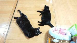 右の小さい方がナナ、腹だしてるのが私の黒猫かんのヘ(≧▽≦ヘ)♪