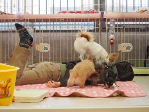 幸い、お泊りの子がいなかったので、こいぬ達はバスケットに入れ、即家に戻って。