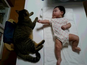 変なねこです、でも赤ちゃんが好きなんでしょうね。優次郎はとても穏やかな猫で、このふたりが並んでいると、プリティすぎて、50プリティ越しそうです。(一日何回プリティか)