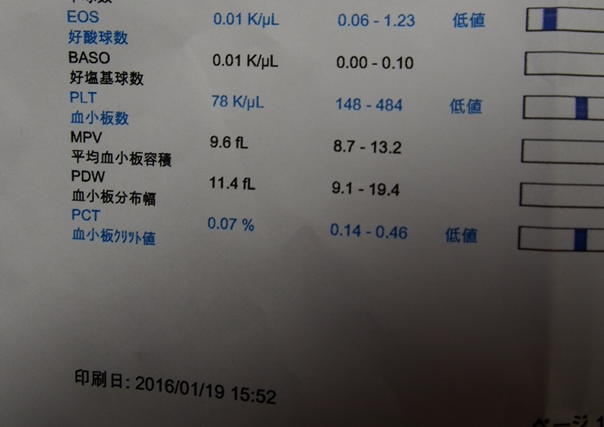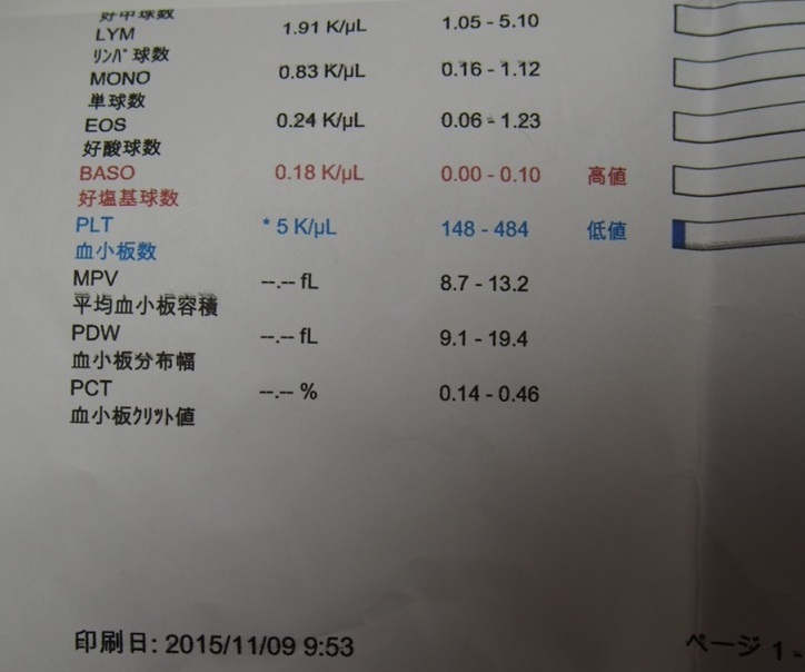 一番見て頂く簡単な所は、血小板が「5」。右側、148~484が標準値。