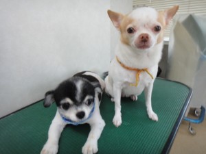 左のチワワ、一休くん^^彼もるんるんっこ、スムチーに見えますが、皮膚を悪くしてからずっと、ぼっちゃんカット♪ティニーと一休ふたりとも、ぼっけぇ~~~っとしてます^^ま、るんるん慣れてるってか、近所の駄菓子屋感覚かな(笑)